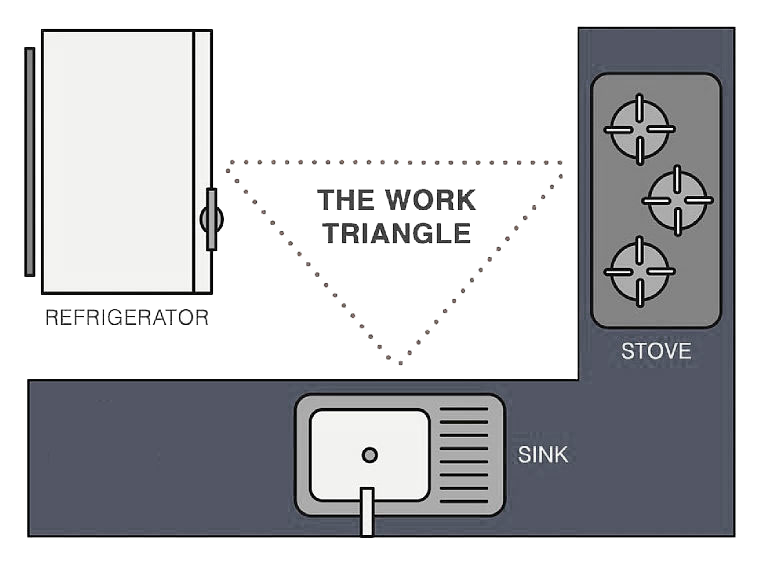 If your kitchen can’t accommodate a triangle, galley kitchens, for instance use zone planning instead. Prep zone near the sink. Cooking zone at the stove. Cleanup zone by the dishwasher. Logical.